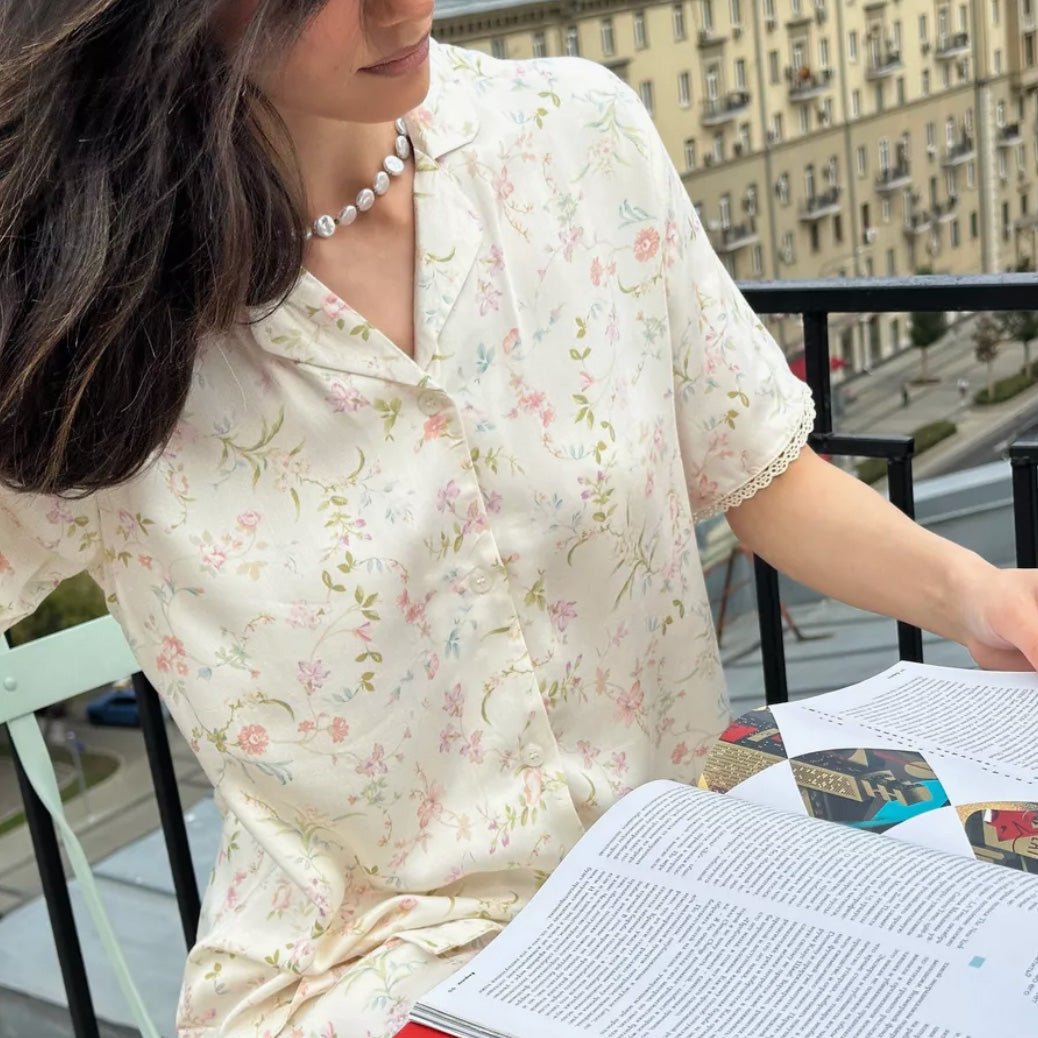 Crafted from 100% premium viscose, this set is silky-smooth, featherlight, and naturally breathable—perfect for cool, cozy nights and restful mornings. The delicate floral print, inspired by blooms under moonlight, adds a romantic, timeless charm.